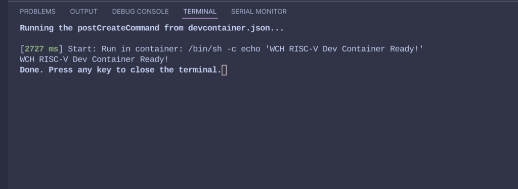 "postCreateCommand": "echo 'WCH RISC-V Dev Container Ready!'",